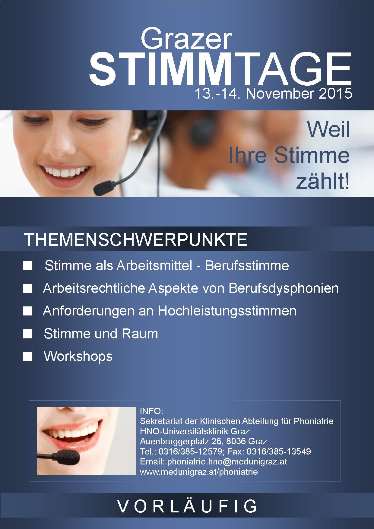 13. und 14. November 2015 HNO Universitätsklinik Graz, Auenbruggerplatz 26, 8036 Graz Informationen: Sekretariat der Klinischen Abteilung für Phoniatrie Tel: 0316/385-12579; Fax: 0316/385-13549 |